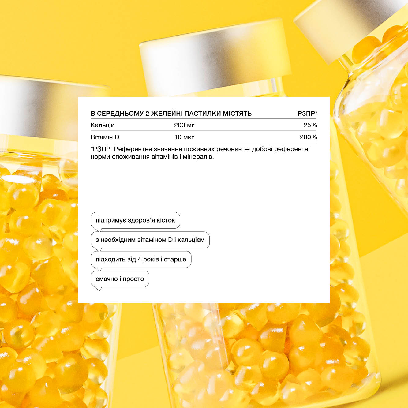 Glucose syrup, sugar, tricalcium phosphate, water, gelling agent (pectin), acidulant (citric acid), acidity regulator (sodium citrate), natural aroma, coconut oil, Vitamin D, colorant (anthocyanins), anti-caking agent (carnauba wax).