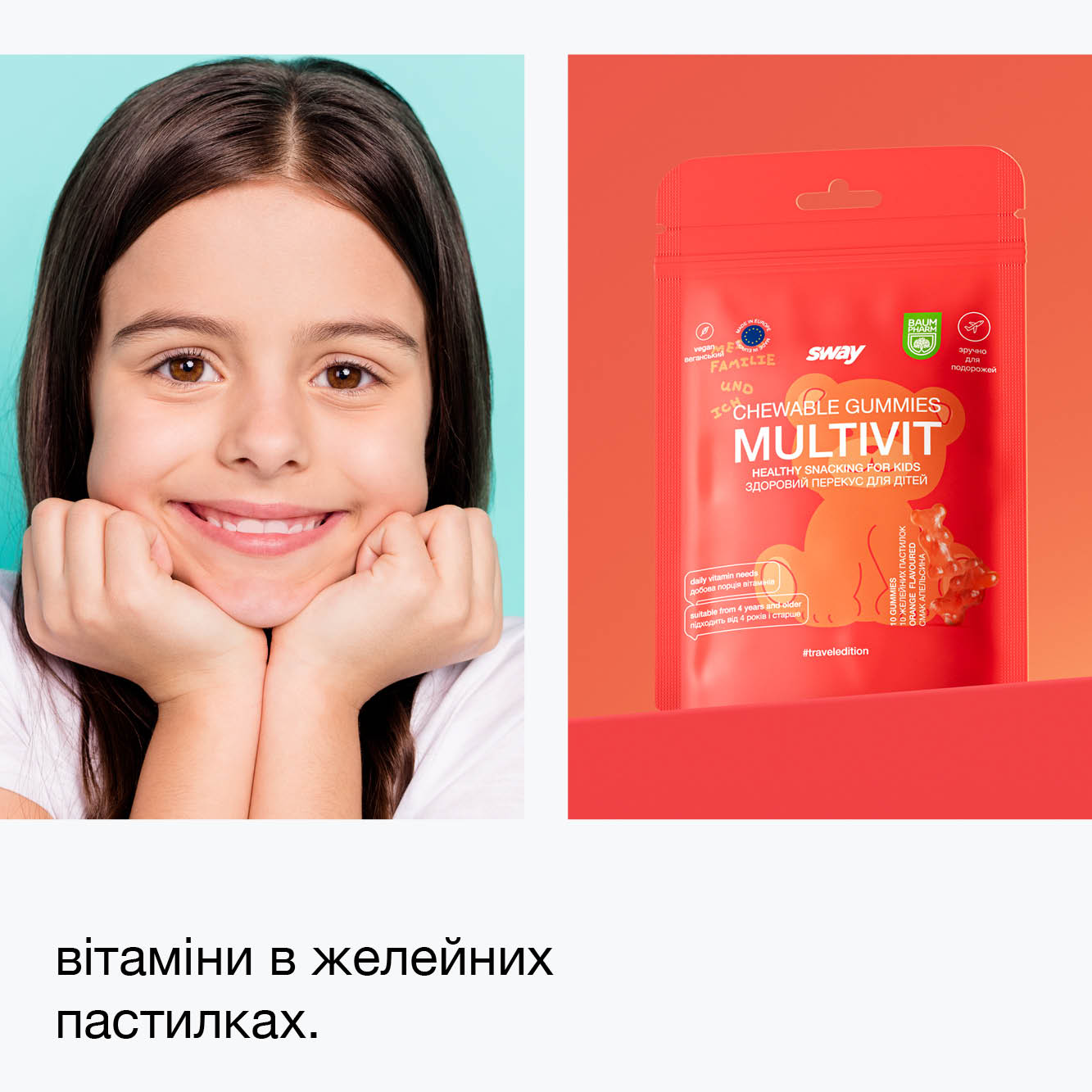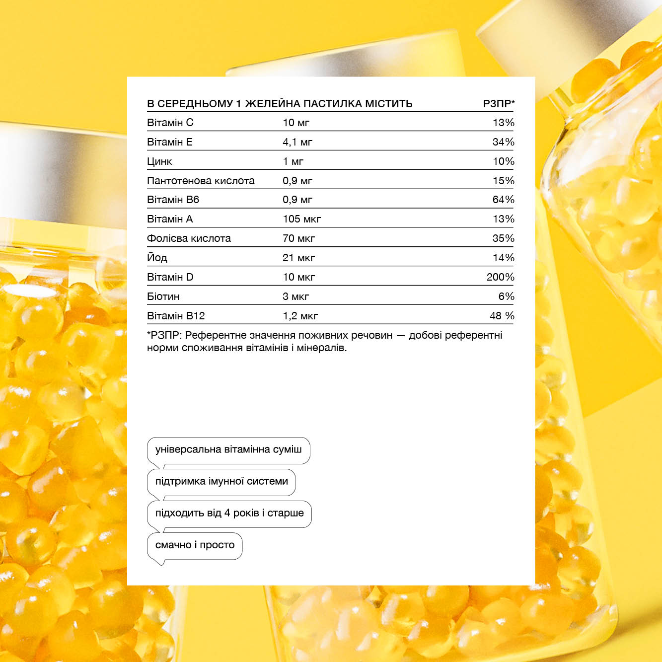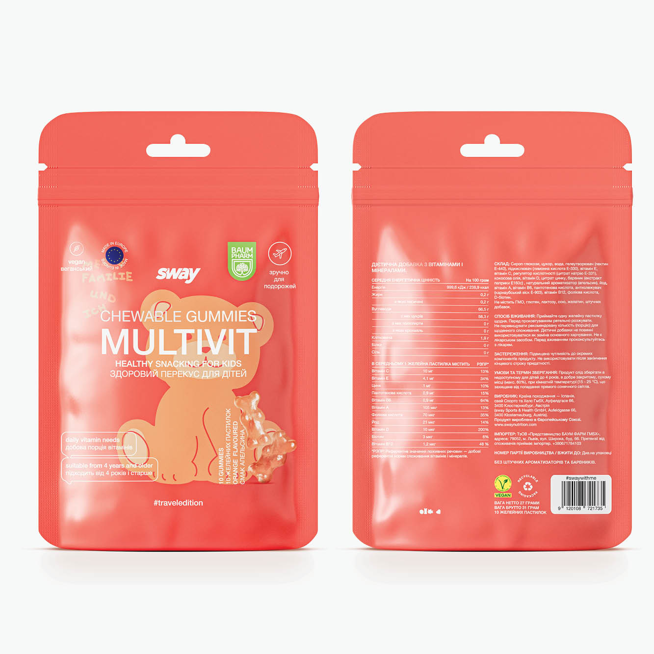 Glucose syrup, sugar, water, gelling agent (pectin), acidulant (citric acid), Vitamin E, Vitamin C, acidity regulator (sodium citrate), coconut oil, Vitamin D, zinc citrate, colorant (paprika extract), natural aroma, iodine, Vitamin A, Vitamin B6, pantothenic acid, anti-caking agent (carnauba wax), Vitamin B12, folic acid, D-biotin.