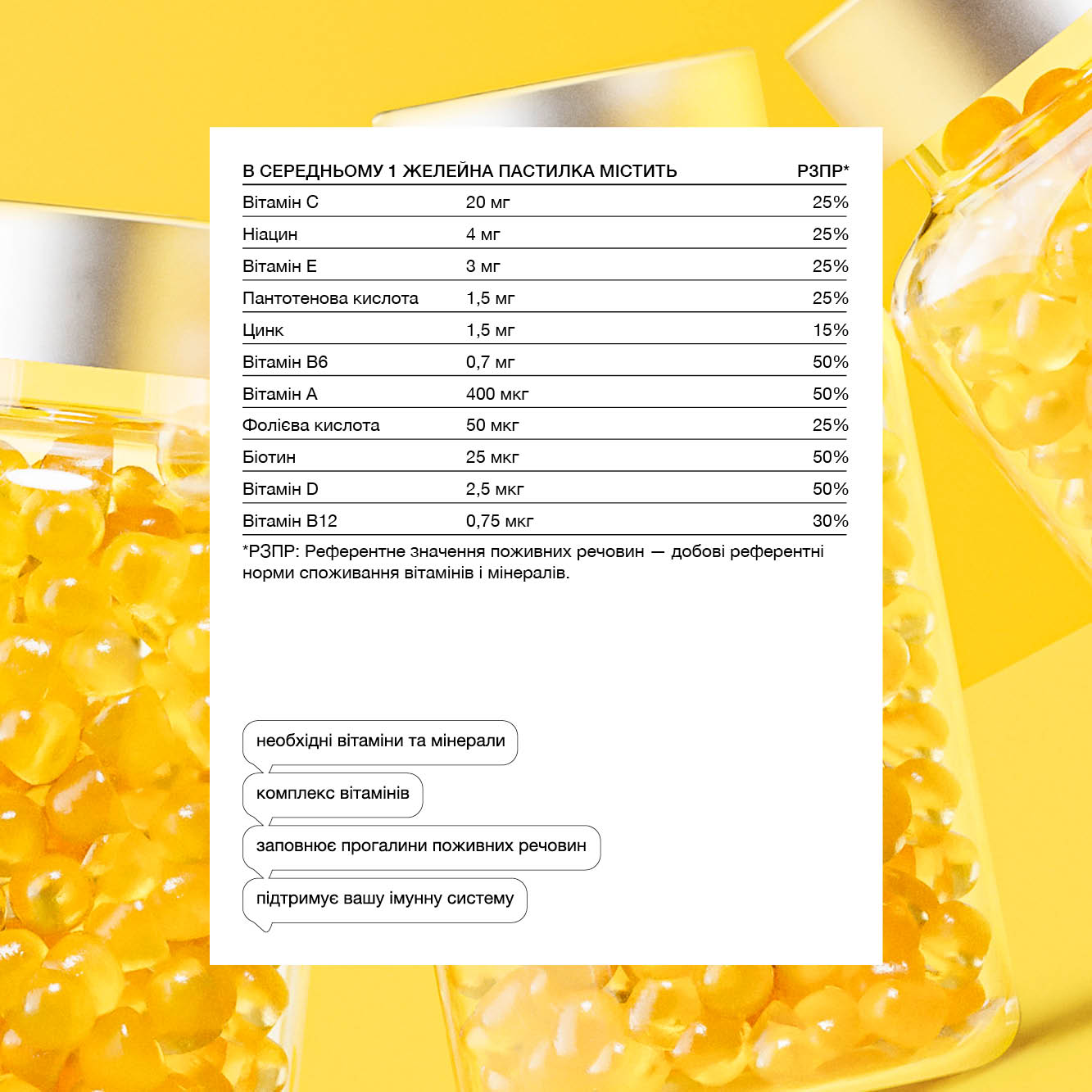 Glucose syrup, sugar, water, gelling agent (pectin), acidulant (citric acid), Vitamin C, maltodextrin, Vitamin E, natural aroma, acidity regulator (sodium citrate), coconut oil, Vitamin A, zinc citrate, niacin, colorant (anthocyanins), pantothenic acid, Vitamin D, Vitamin B6, anti-caking agent (carnauba wax), Vitamin B12, folic acid, D-biotin.