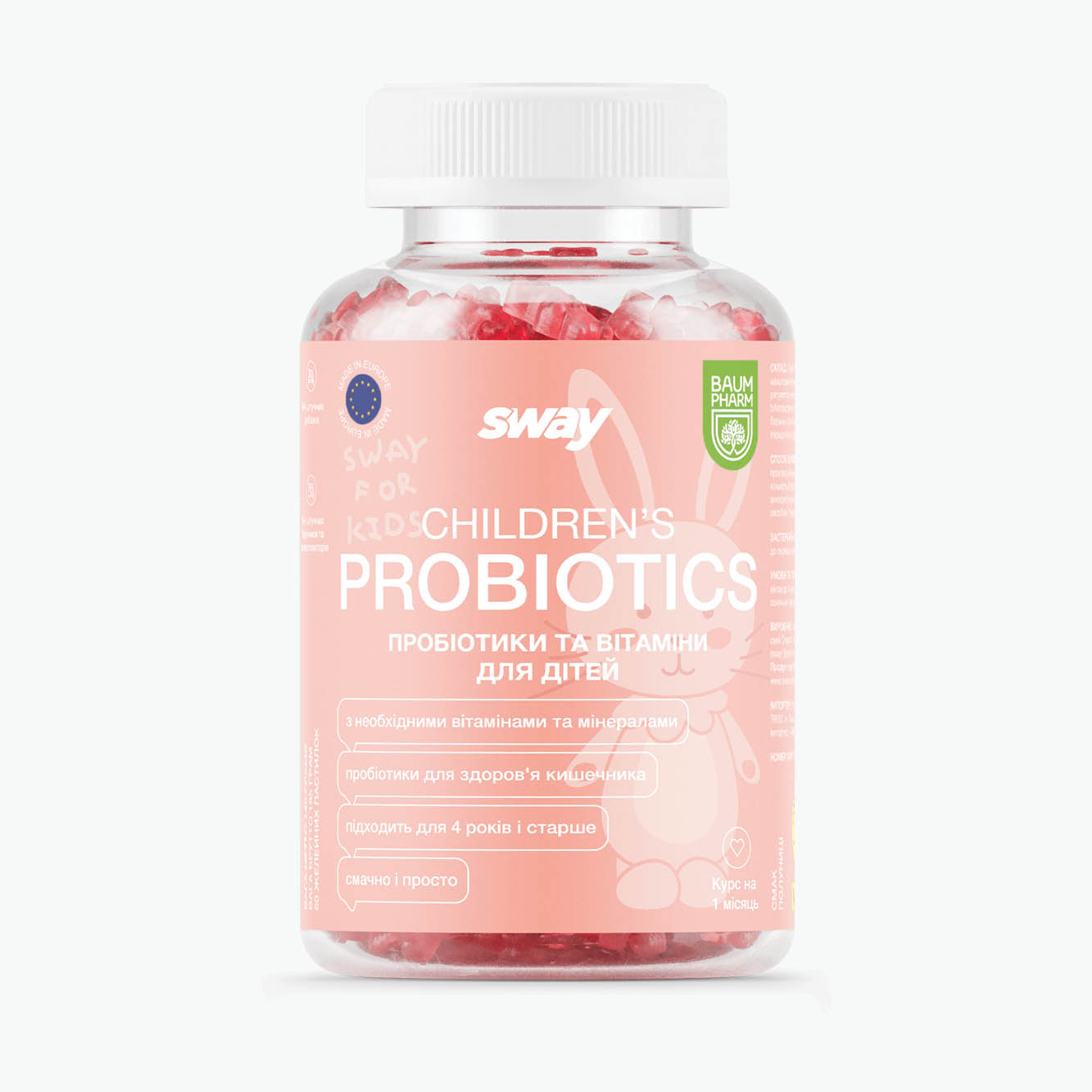 Probiotics + Vitamins Kids gummies support gut health and digestion while promoting overall well-being. With a combination of beneficial probiotic strains Bifidobacterium infantis and Lactobacillus rhamnosus, plus essential vitamins like niacin, pantothenic acid, and vitamin B6, these gummies help maintain a balanced microbiome and support digestive comfort—all in a delicious strawberry-flavored gummy.
