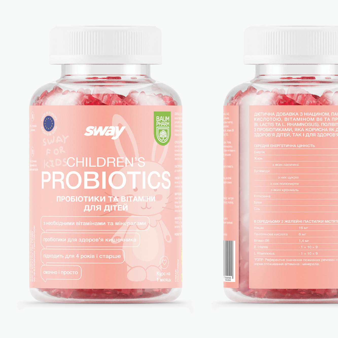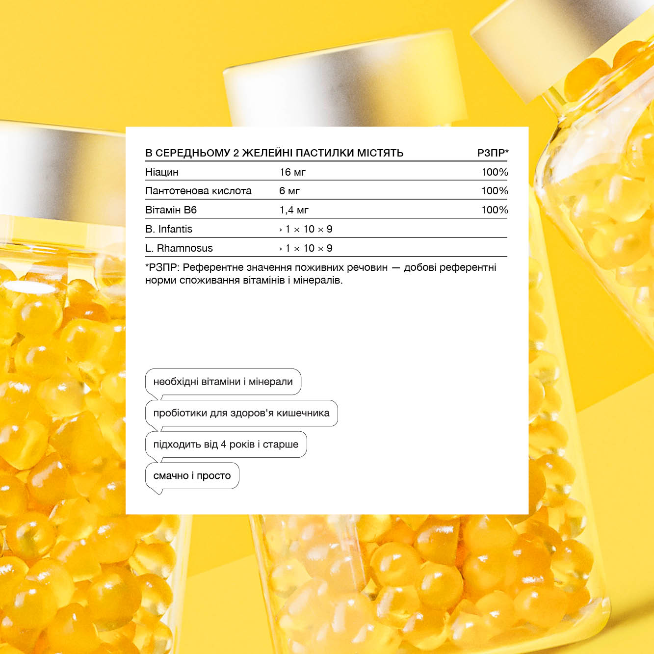 Probiotics + Vitamins Kids gummies are designed to support children’s digestive and immune health by combining probiotics with essential vitamins. Bifidobacterium infantis and Lactobacillus rhamnosus are well-researched probiotic strains that help maintain a balanced gut microbiome, promote digestion, and support a healthy immune system. Niacin and pantothenic acid contribute to normal energy metabolism, while vitamin B6 helps regulate immune responses. These gummies make gut health simple and enjoyable, providing children with a tasty, chewable way to support digestion and overall wellness without the need for pills or powders.