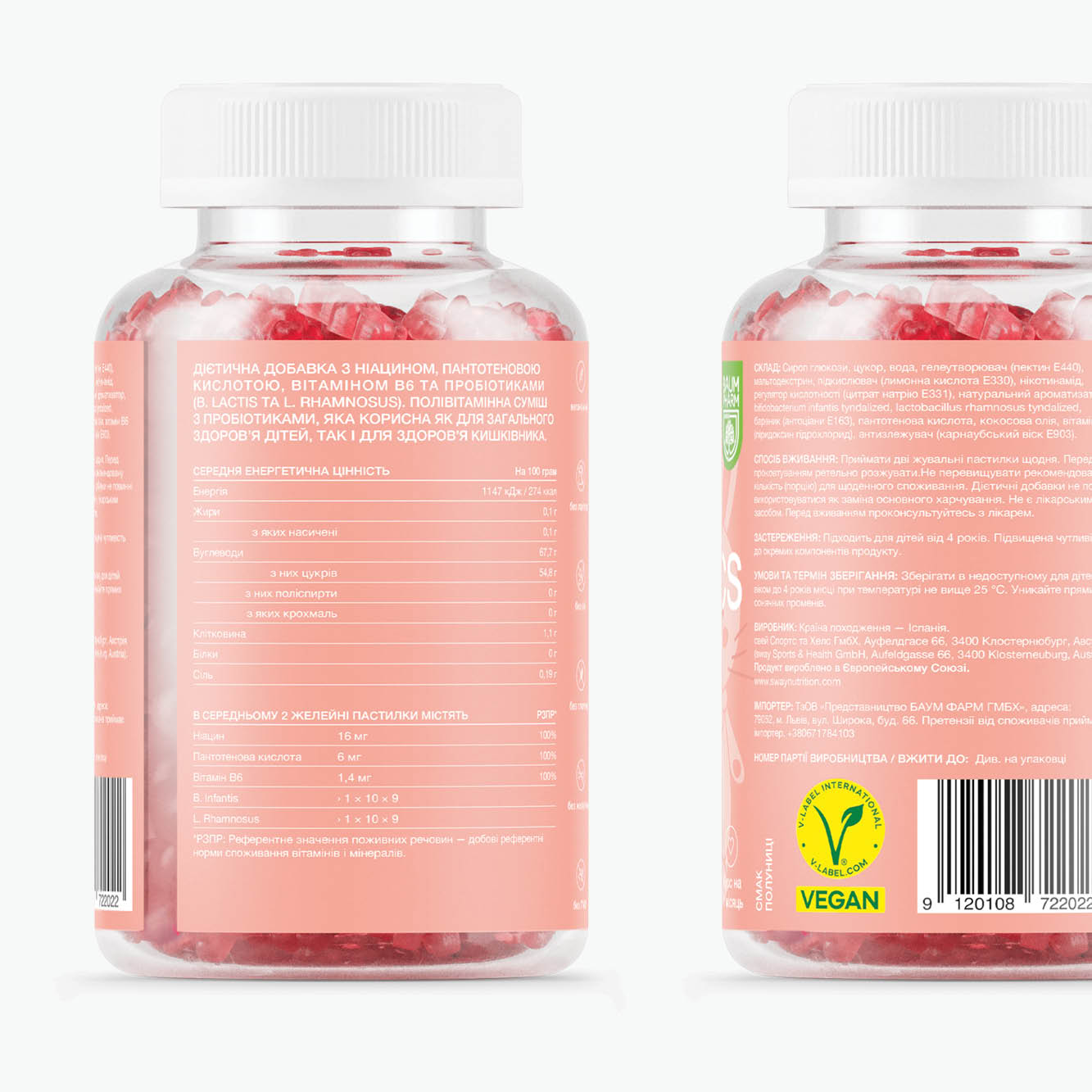 Glucose syrup, sugar, water, gelling agent (pectins), maltodextrin, acidulant (citric acid), niacin, acidity regulator (sodium citrate), natural aroma, bifidobacterium infantis tyndallized, lactobacillus rhamnosus tyndallized, colorant (anthocyanins), pantothenic acid, coconut oil, vitamin B6, anti-caking agent (carnauba wax).