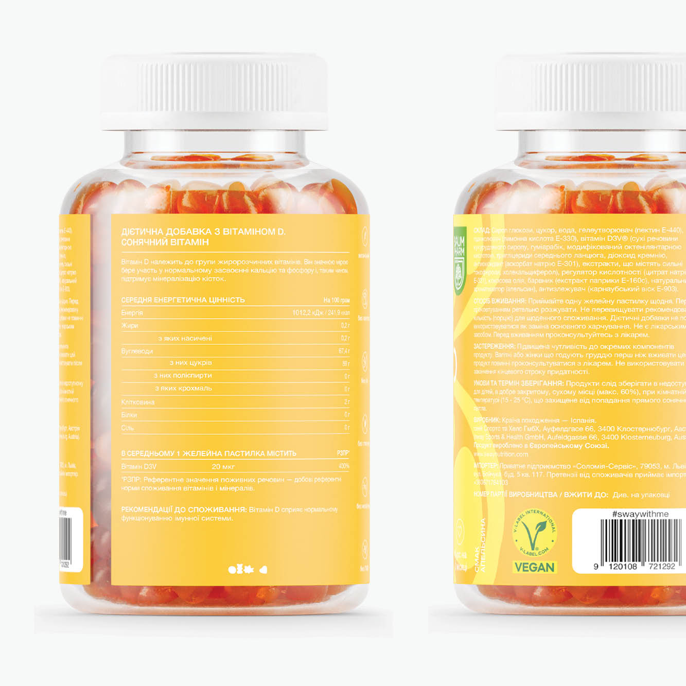Glucose syrup, sugar, water, gelling agent (pectin), acidulant (citric acid), Vitamin D3V® (corn starch syrup solids, gum arabic, medium-chain triglycerides, silicon dioxide, antioxidant (sodium ascorbate), tocopherol-rich extracts, cholecalciferol), acidity regulator (sodium citrate), coconut oil, colorant (paprika extract), natural aroma, anti-caking agent (carnauba wax).